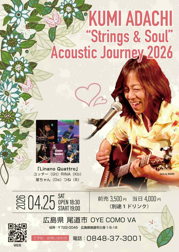 出演 安達久美ギタリスト Home | 安達久美ライヴ情報&… 続きを読む »KUMI ADACHI “Strings&Soul Acoustic Journey2026