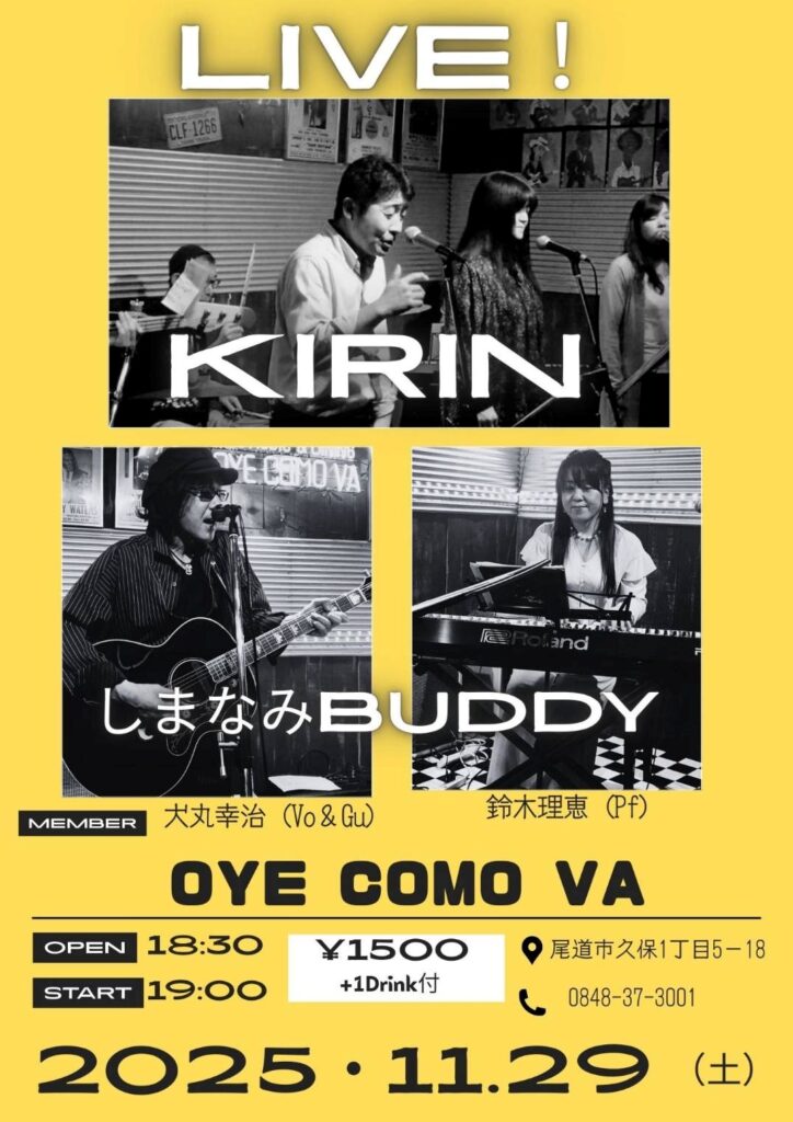 出演 KIRIN~山下達郎コピーバンド しまなみBUDDY~犬丸幸治(Vo.Ag) 鈴木理恵(Pf) Open18:30 Start19:00 ¥1500 1Drink付