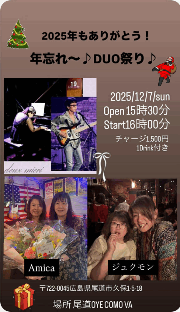 2025年もありがとう! 出演 deux mieri Amika ジュクモン Open15:30 Start16:00 ¥1500 1Drink付