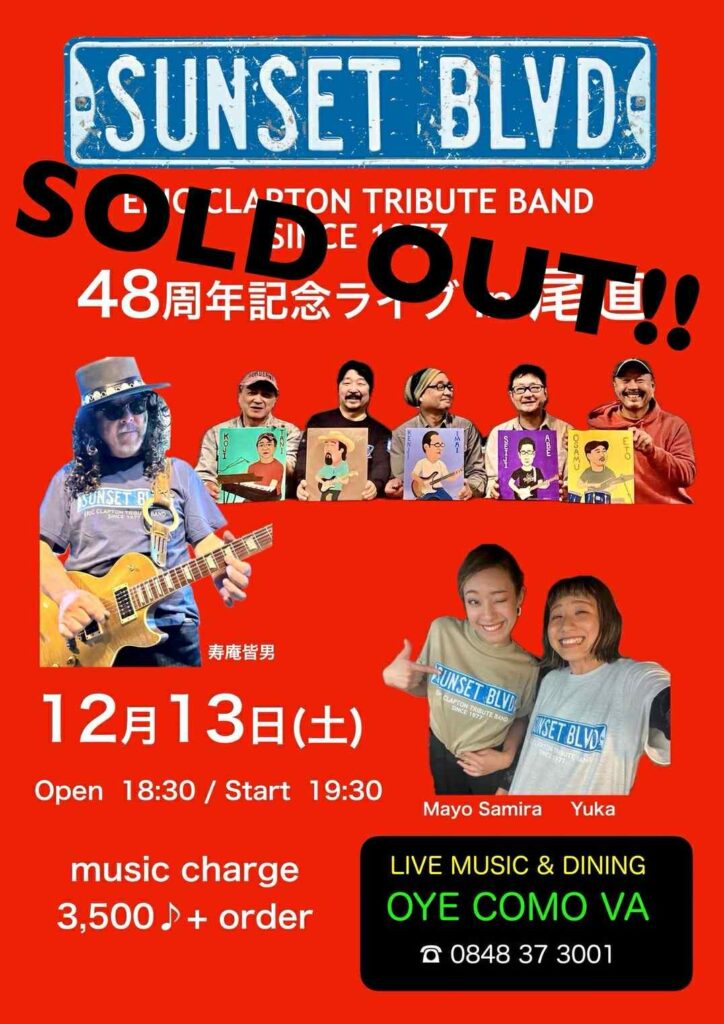 ERIC CLAPTON TRIBUTE BAND SINCE 1977 結成48周年記念ライブ in 尾道 SUNSET BOULEVARD ゲストコーラス:MayoSamira、Yuka Kobayashi ギタリスト:寿庵皆男 Open18:30 Start19:30 SOLDOUT ¥3500 要ドリンクオーダー