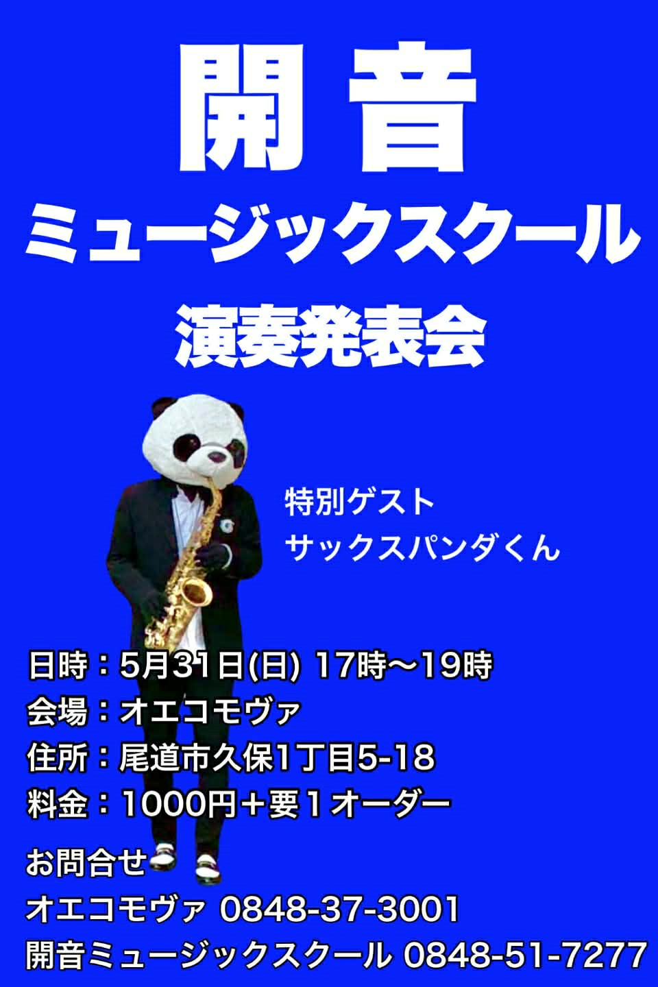 音楽発表会 特別ゲスト:サックスパンダくん Open16:30 Start17:00 ¥1000 要ドリンクオ… 続きを読む »開音ミュージックスクール演奏発表会